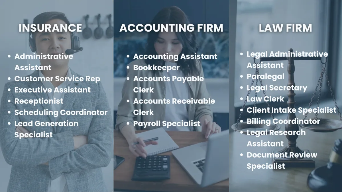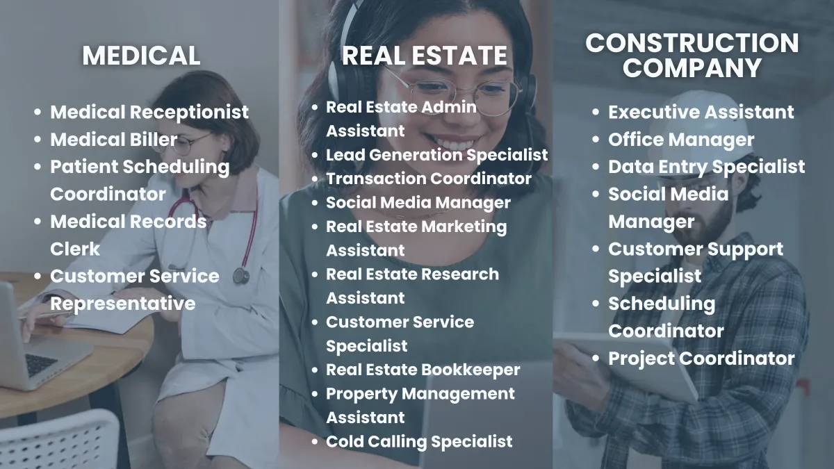 Our Virtual Assistants are skilled in a wide range of tasks, including but not limited to: Administrative support (calendar management, email management, data entry)Appointment setting and lead generation, Customer service and client management, Marketing support (social media, content creation, campaign management)Industry-specific support (real estate transactions, legal document preparation, medical office management)